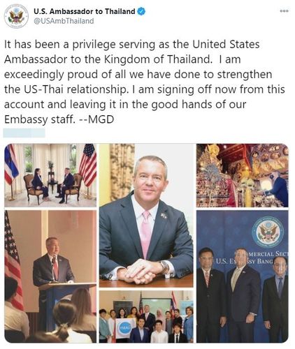 21일 온라인 매체 카오솟에 따르면 디삼브리 대사는 20일 주태국 미국 대사관 공식 트위터에 주태국 대사로 일한 것은 영광스러운 일이었다며 '이임 소식'을 전했다.