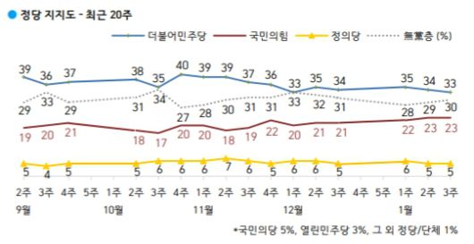 정당 지지도는 더불어민주당 33%, 무당층 30%, 국민의힘 23%, 정의당과 국민의당 각각 5%, 열린민주당 3% 등으로 집계됐다.