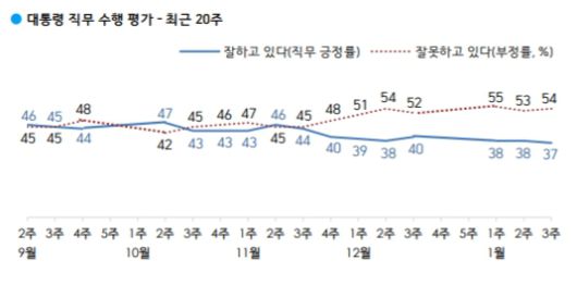 22일 여론조사업체 한국갤럽이 발표한 1월 3주차 문 대통령 직무수행 평가에 따르면 긍정평가는 37%, 부정평가는 54%로 나타났다.