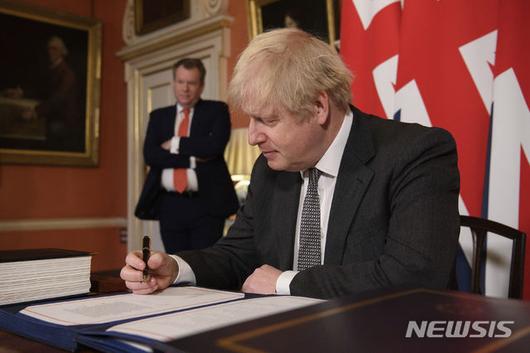 [런던=AP/뉴시스]보리스 존슨 영국 총리가 30일(현지시간) 런던 총리 관저에서 데이비드 프로스트(왼쪽) 영국 통상교섭본부장이 지켜보는 가운데 브렉시트(영국의 유럽연합 탈퇴) 관련 미래관계 협정 합의안에 서명하고 있다. 2020.12.31. |