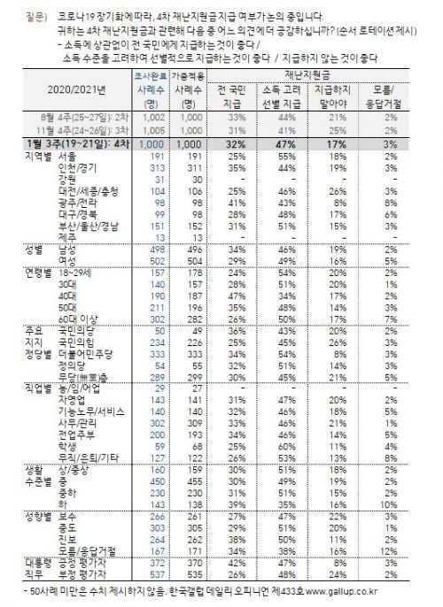갤럽은 "수령률 99%를 웃돌았던 1차와 선별 지급된 2·3차 재난지원금 두 방식 모두 경험한 상태에서 추가 재난지원금을 보는 유권자의 시각이라는 데 의미가 있다"고 밝혔다.