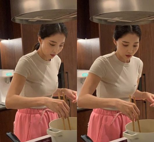 공개된 사진 속에는 오윤아가 자택에서 요리를 하며 인증샷을 남기고 있는 모습이 담겨 있다. 오윤아는 티셔츠 한 장을 입고 섹시한 매력을 과시, 팬들을 감탄하게 만들었다.