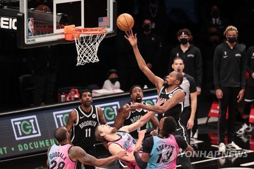 마이애미의 수비를 뚫고 슛을 시도하는 브루클린의 듀랜트 |