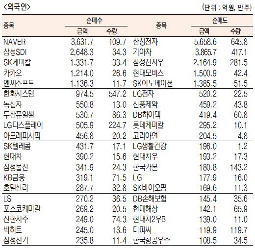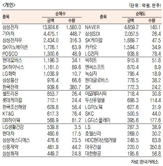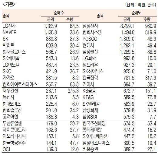 [표]주간 유가증권 기관·외국인·개인 순매수·도 상위종목(1월 18~22일)