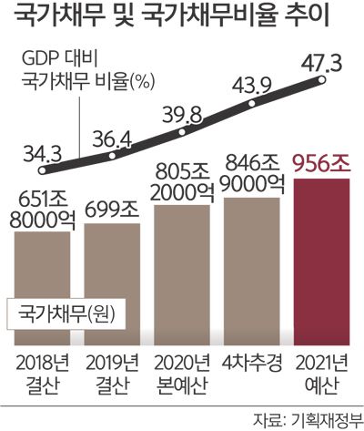 문제는 재원을 어떻게 마련하느냐다. 입법 과정에서 쟁점이 될 것으로 보인다. 단기적으로는 국채 발행, 중장기적으로는 증세라는 수단이 있지만 둘 다 여의치 않다. 적자국채 발행은 지난해 104조원, 올해 93조5000억원, 내년에도 100조원을 넘어설 전망이다. 이에 따라 국내총생산(GDP) 대비 국가채무 비중은 지난해 말 43.9%에서 올해 47.3%로, 내년에는 50% 선을 넘을 것으로 예상된다. 증세는 국민적 합의가 선행돼야 하는데, 지금 같은 경제 위기 상황에서는 꺼내기 어려운 카드다.