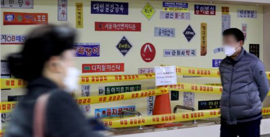 22일 오후 서울 을지로 지하상가 내 신종 코로나바이러스 감염증(코로나19) 예방을 위해 폐쇄된 휴게공간에 주변 상점의 안내판이 붙어 있다. 뉴스1 |