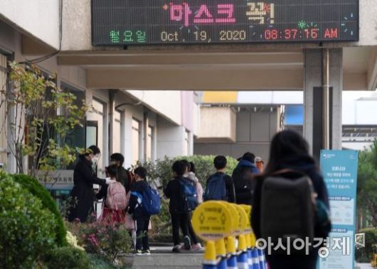 사회적 거리두기 1단계 조정에 따라 전국 유·초·중·고 등교수업이 확대된 19일 서울 금천구 문백초등학교에서 아이들이 등교하고 있다. 교육계에 따르면 이날부터 전국 모든 지역의 등교 인원을 3분의 2로 확대하기로 했다. 수도권 학교와 과대학교·과밀학급은 이 기준을 준수해야 하지만 비수도권은 여건에 따라 밀집도를 조정할 수 있도록 길을 열어놔 모든 학생이 매일 학교에 가는 '전면 등교'도 가능해졌다./김현민 기자 kimhyun81@ |