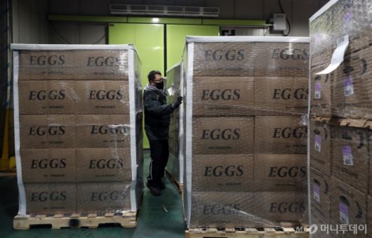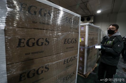 고병원성 조류인플루엔자(AI) 확산으로 국내 계란 가격이 급등하고 있는 가운데 25일 인천국제공항 아시아나항공 화물터미널에서 관계자들이 미국산 계란의 운송 상태를 점검하고 있다.