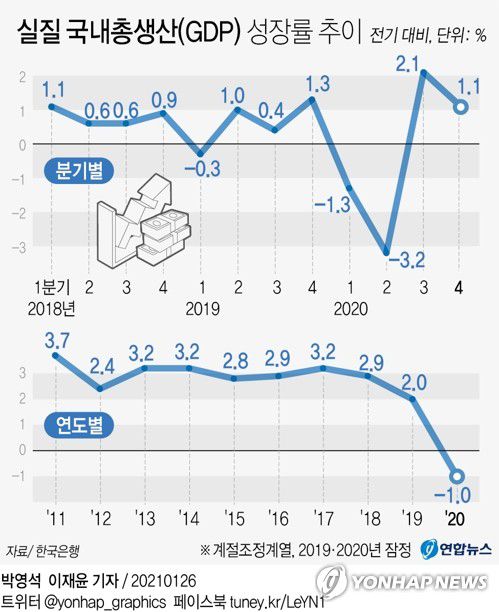지난해 분기별 성장률은 코로나19 충격으로 1분기(-1.3%)와 2분기(-3.2%) 연속 뒷걸음친 뒤, 3분기와 4분기 각 2.1%, 1.1% 반등했다.