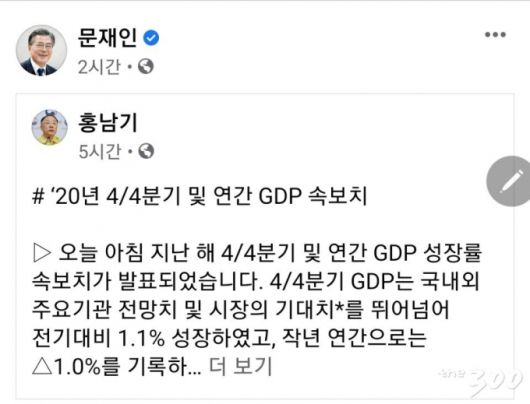 [the300]문재인 대통령이 26일 홍남기 부총리 겸 기획재정부 장관이 페이스북에 올린 한국은행의 지난해 4분기 및 연간 GDP(국내총생산) 속보치 발표에 대한 분석글을 자신의 SNS에 공유했다.