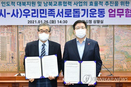 (수원=연합뉴스) 김인유 기자 = 경기 수원시는 26일 대북 인도지원단체인 우리민족서로돕기운동과 대북 인도적 지원사업 및 남북공동 협력사업 추진을 위한 업무협약을 체결했다.