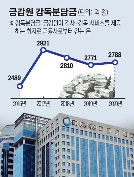 금융사들도 현 감독분담금 제도에 대해 불만의 목소리가 높다. 금융위원회의 금융기관 분담금 징수에 관한 규정에 따르면 금융사의 금융사고 등에 따른 추가적인 검사로 투입된 금감원 인원 수가 증가하면 분담금을 추가로 징수할 수 있다. 해당 규정에 따라 하나은행과 우리은행은 올해 46억9000만 원과 46억 원을 각각 추가로 내야 한다. 금감원이 2019년 DLF(파생결합펀드) 사태로 두 은행에 대한 부문검사를 여러 차례 실시한 것이 그 배경이다. 은행권 관계자는 “금감원 검사 이후 제재심의위원회, 분쟁조정위원회가 개최되면 해당 위원회 결정에 근거해 경우에 따라서는 몇천억 원을 배상한다. 그런데 금융사고가 발생했다고 분담금을 추가로 부과하는 것은 이중 부담”이라고 말했다.