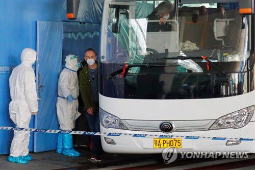 중국 우한 도착해 버스 오르는 WHO '코로나19 기원' 조사팀 |