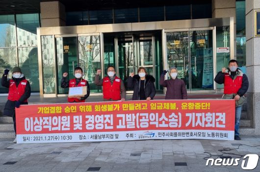 민주노총 전국공공운수노조와 민주사회를위한변호사모임 노동위원회는 27일 서울 남부지검 앞에서 기자회견을 열고 있다. 2021.01.27/뉴스1 © 뉴스1 온다예 기자 |