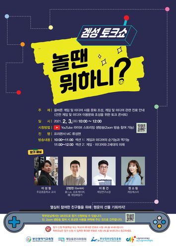 (부산=연합뉴스) 박창수 기자 = 부산정보산업진흥원은 내달 3일 지역 초·중·고교생과 학부모를 대상으로 건전한 게임 및 미디어 이용문화 조성을 위한 비대면 토크 콘서트 '겜성 토크쇼, 놀 때 뭐하니'를 개최한다고 27일 밝혔다.