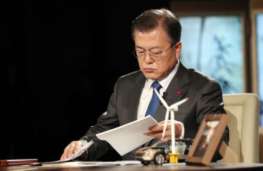문재인 대통령이 27일 청와대에서 화상으로 열린 2021 세계경제포럼(WEF) 한국정상 특별연설에 참석, 자료를 보고 있다. 연합뉴스 |