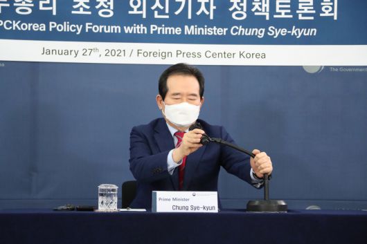정세균 국무총리가 27일 서울 프레스센터에서 열린 국무총리 초청 외신기자 정책토론회에 참석해 발언하기 전 마이크를 조정하고 있다. 연합뉴스 |