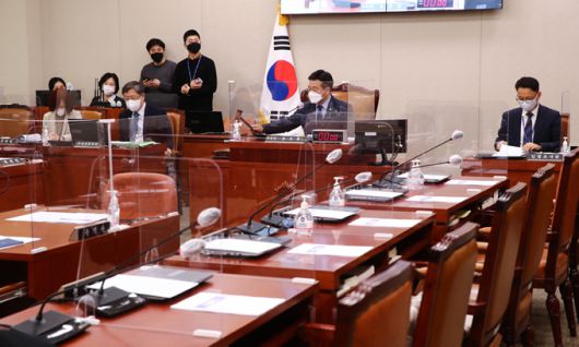 윤호중 국회 법제사법위원장이 27일 서울 여의도 국회에서 열린 법제사법위원회 전체회의에서 박범계 법무부 장관 후보자에 대한 인사청문경과보고서 채택의 건을 처리하고 있다. 국민의힘 의원들은 청문보고서 채택에 반대하며 회의에 불참했다. 연합뉴스 |