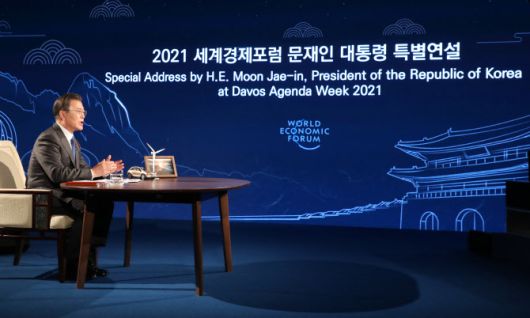 문 대통령은 이날 오후 4시 WEF 주최 ‘2021 다보스 아젠다 한국정상 특별연설’ 화상회의 마무리발언에서 “코로나 같은 신종 감염병과의 전쟁에서 이길 수 있는 가장 강력한 무기는 국제사회의 ‘연대와 협력’”이라면서 이처럼 밝혔다. 문 대통령이 다보스 아젠다 주간에 초청받은 것은 이번이 처음이다.