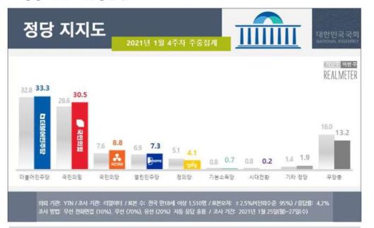 정당 지지율에서는 더불어민주당과 국민의힘이 동반 상승했다. 4월 보궐선거를 앞두고 무당층이 줄어들면서 지지층이 결집하는 모양새다. 민주당 지지율은 33.3%로 지난주 보다 0.5%포인트 올랐다. 국민의힘도 30.5%로 전주 대비 1.9%포인트 상승했다. 국민의당은 지난주보다 1.2%포인트 오른 8.8%, 열린민주당은 0.4%포인트 오른 7.3%였다. 김종철 전 대표의 성추행 사건으로 혼란을 겪고 있는 정의당은 지난주 보다 1%포인트 내려간 4.1%를 기록했다.