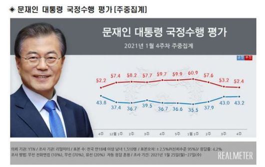 여론조사전문기관 리얼미터는 YTN의뢰로 지난 25∼27일 전국 18세 이상 국민 1510명을 대상으로 문 대통령 국정 수행 평가를 조사한 결과(신뢰수준 95%에 표본오차 ±2.5%포인트) 긍정적이라고 답한 비율이 43.2%로 조사됐다. 지난주 대비 0.2%포인트 오른 수치다. 부정평가는 52.4%로 전주 보다 0.8%포인트 내려갔다.