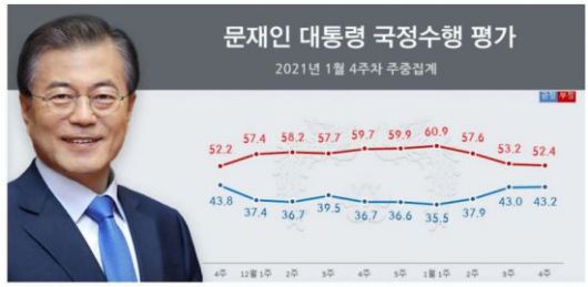[아시아경제 오주연 기자] 문재인 대통령의 국정 수행 지지율이 3주 연속 상승했다. 당 지지도는 더불어민주당이 2주 연속 국민의힘을 앞질렀다.