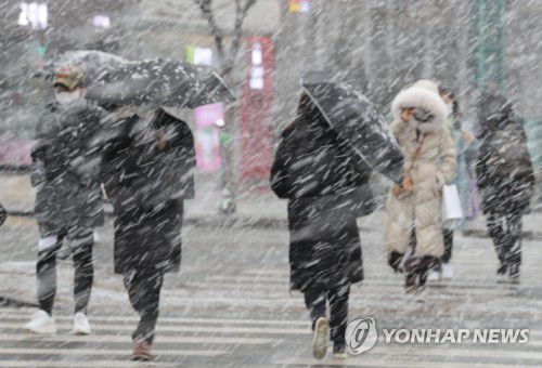 (서울=연합뉴스) 백승렬 기자 = 서울과 경기 북부에 대설주의보가 내려진 28일 서울 광화문 네거리 인근에서 시민들이 눈을 맞으며 걸어가고 있다. 2021.1.28 srbaek@yna.co.kr <저작권자(c)연합뉴스. 무단전재-재배포금지.>
