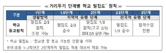 교육부는 "사회적 거리두기 단계와 연계한 밀집도 원칙 범위 내에서 지역·학교별로 학사 운영을 탄력적으로 할 수 있다"며 "시간표 변경을 포함한 각종 학사조치, 방역조치, 급식 준비 등 밀집도 변경에 따른 각종 준비 기간을 고려해 시도교육청, 학교와 협업을 강화한다"고 밝혔다.