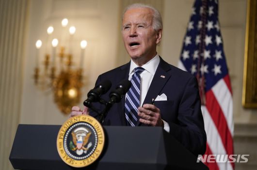 [워싱턴=AP/뉴시스]조 바이든 미국 대통령이 27일(현지시간) 백악관에서 기후변화와 녹색일자리 창출에 관해 연설하고 있다. 2021.01.28. |