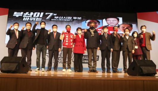 28일 부산 벡스코에서 열린 국민의힘 부산시장 보궐선거 예비경선 심사를 위한 예비후보 비전 발표회에서 박형준, 전성하, 이언주, 박민식, 이진복, 박성훈 후보자와 참석자들이 기념촬영을 하고 있다. (사진=연합뉴스) |