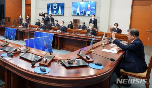 [서울=뉴시스박영태 기자 = 문재인 대통령이 28일 오후 청와대에서 샤브카트 미르지요예프 우즈베키스탄 대통령과 한-우즈베키스탄 화상 정상회담을 하고 있다. 2021.01.28. since1999@newsis.com |