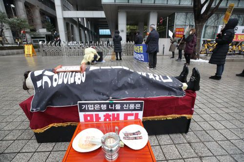 ‘기업은행 디스커버리펀드 사기피해대책위원회’가 28일 서울 영등포구 여의도 금융감독원 앞에서 ‘금감원의 디스커버리펀드 사기판매 책임자 중징계를 촉구하는 장례식 퍼포먼스’를 하고 있다. (사진=연합뉴스) |