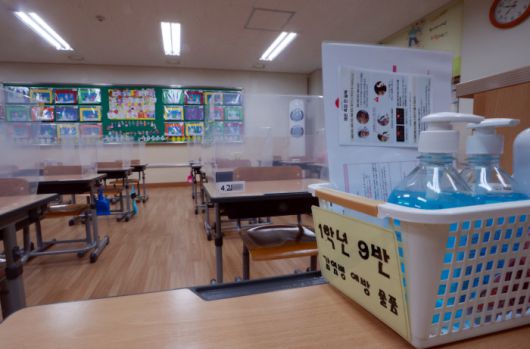 지난 28일 오전 비대면 원격 수업으로 개학한 서울 서초구 언남초등학교 1학년 9반 교실에 방역 물품이 비치돼 있다. 연합뉴스 |
