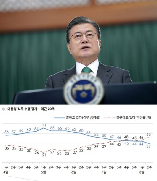 문재인 대통령 직무 수행평가 추이표/사진=뉴스1, 한국갤럽 |