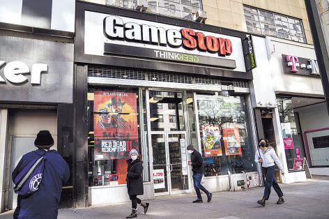 28일(현지시간) 미국 뉴욕 맨해튼에 있는 게임스탑 매장 앞을 행인들이 지나가고 있다. [AP 연합] |