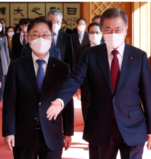 문재인 대통령이 29일 오후 청와대에서 박범계 법무부 장관에게 임명장을 수여한 뒤 환담장으로 이동하고 있다.(사진=연합뉴스) |