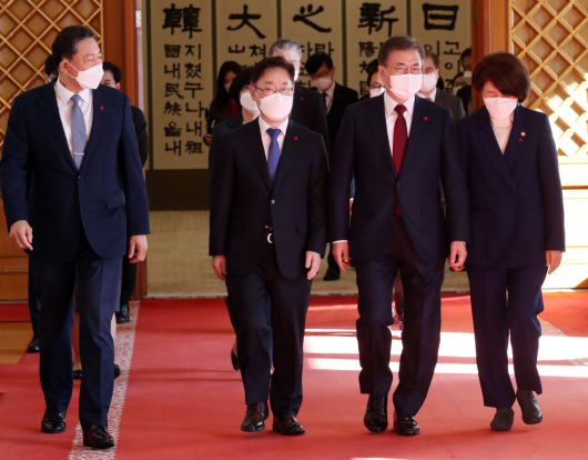 문재인 대통령이 29일 박범계 법무부 장관과 한정애 환경부 장관, 황기철 국가보훈처장에 임명장을 수여한 뒤 환담장으로 이동하고 있다.[연합] |