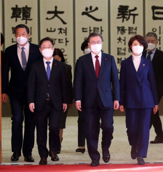 문재인 대통령이 29일 오후 청와대에서 박범계 법무부 장관(왼쪽 두번째), 한정애 환경부 장관(오른쪽), 황기철 국가보훈처장(왼쪽)에게 임명장을 수여한 뒤 환담장으로 이동하고 있다.(사진=연합뉴스) |
