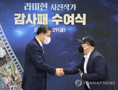 (서울=연합뉴스) 황기철 국가보훈처장이 29일 오후 서울지방보훈청에서 사진작가 라미현 씨에게 감사패를 수여한 뒤 악수하고 있다.
