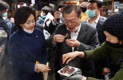 2020년 2월 12일 서울 남대문시장을 찾은 박영선(왼쪽) 당시 중소벤처기업부 장관과 문재인 대통령. /페이스북 |