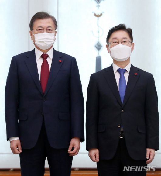 [서울=뉴시스]박영태 기자 = 문재인 대통령이 29일 오후 청와대에서 박범계 신임 법무부장관에게 임명장을 수여하기 전 인사하고 있다. 2021.01.29. since1999@newsis.com |