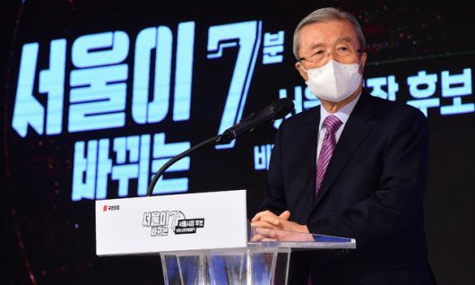 김종인 국민의힘 비상대책위원장이 29일 서울 용산구 백범김구기념관에서 열린 서울시장 후보 비전스토리텔링PT에서 격려사를 하고 있다. 뉴시스 |