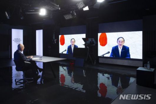 [다보스=AP/뉴시스]스가 요시히데 일본 총리(화면)가 29일(현지시간) 세계경제포럼(다보스 포럼)에서 화상 연설을 하고 있다. 2021.01.30. /사진=뉴시스 |