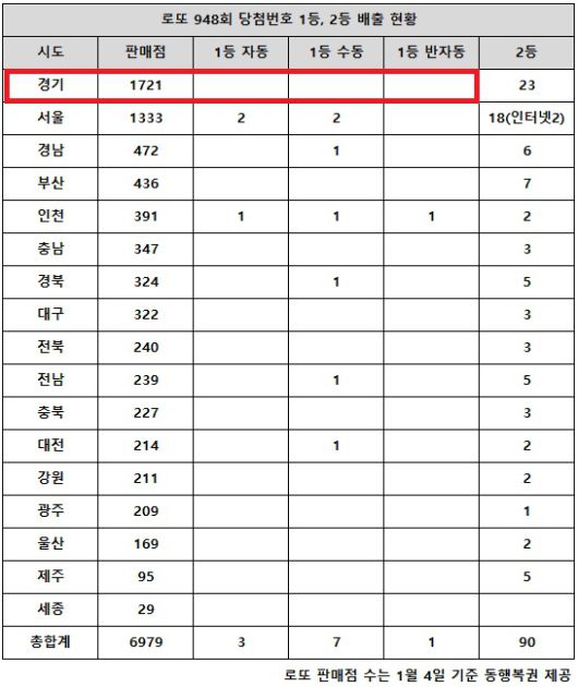로또 948회 당첨번호 1등을 배출한 지역은 서울 판매점 1333곳 중 4곳(자동·수동 각 2곳), 인천 391곳 중 3곳(자동·수동·반자동 각 1곳), 경남 472곳 중 1곳(수동), 경북 324곳 중 1곳(수동), 전남 239곳 중 1곳(수동), 대전 214곳 중 1곳(수동)이다.
