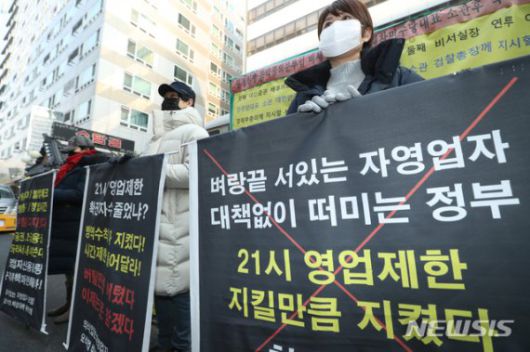 정부가 코로나19 확산 방지를 위해 5인 이상 집합금지와 식당 영업시간 제한을 2주 더 연장하기로 하자, 자영업자 단체들이 "자영업자의 생존권을 무시한 결정"이라며 반발하고 있다. 이들은 "최근 집단발병 사태는 자영업과는 무관하다"며 "자영업을 희생양 삼고 있다"고 강도높게 비판했다.