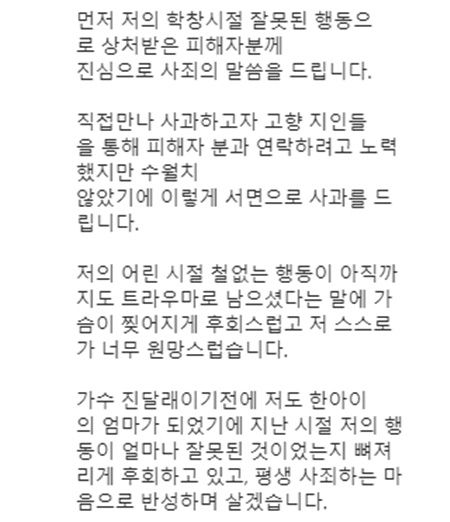 이어 "직접만나 사과하고자 고향 지인들을 통해 피해자 분과 연락하려고 노력했지만 수월치 않았기에 이렇게 서면으로 사과를 드린다"며 "저의 어린 시절 철없는 행동이 아직까지도 트라우마로 남으셨다는 말에 가슴이 찢어지게 후회스럽고 저 스스로가 너무 원망스럽다"고 밝혔다.