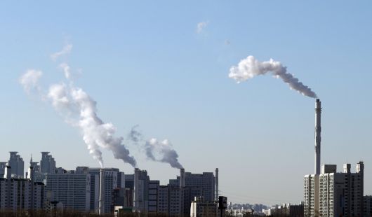 서울 목동의 열병합발전소에서 나온 수증기가 하늘로 올라가고 있다. 연합뉴스 |