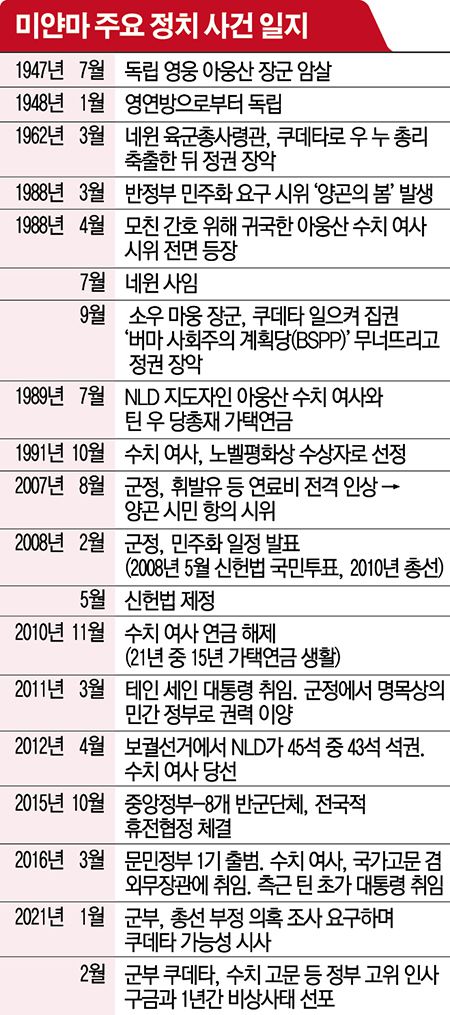 53년간 미얀마를 통치했던 군부가 정권을 내준지 5년여 만에 다시 쿠데타를 일으켰다. 군부는 아웅산 수치 국가고문 등을 구금하고 1년간 비상사태를 선포했다.