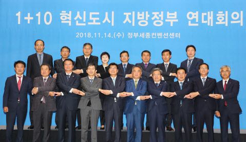 2018년 11월 14일 세종시 정부세종컨벤션센터에서 열린 1+10 혁신도시 지방정부 연대회의에서 이춘희 세종시장(앞줄 왼쪽 5번째부터 오른쪽으로), 송재호 국가균형발전위원장과 지방 혁신도시 대표자들이 함께 기념 촬영을 하고 있다.