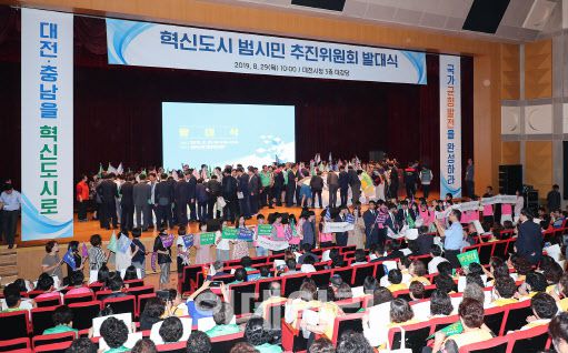 대전시와 충남도에 거주하는 지역주민들과 시민사회단체 인사들이 2019년 8월 29일 혁신도시 범시민 추진위원회를 구성한 뒤 대전시청사에서 발대식을 열고 있다.